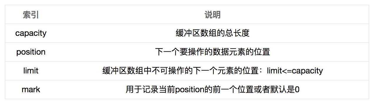 可以把Buffer简单地理解为一组基本数据类型的元素列表,它通过几个变量来保存这个数据的当前位置状态:capacity, position, limit, mark:
