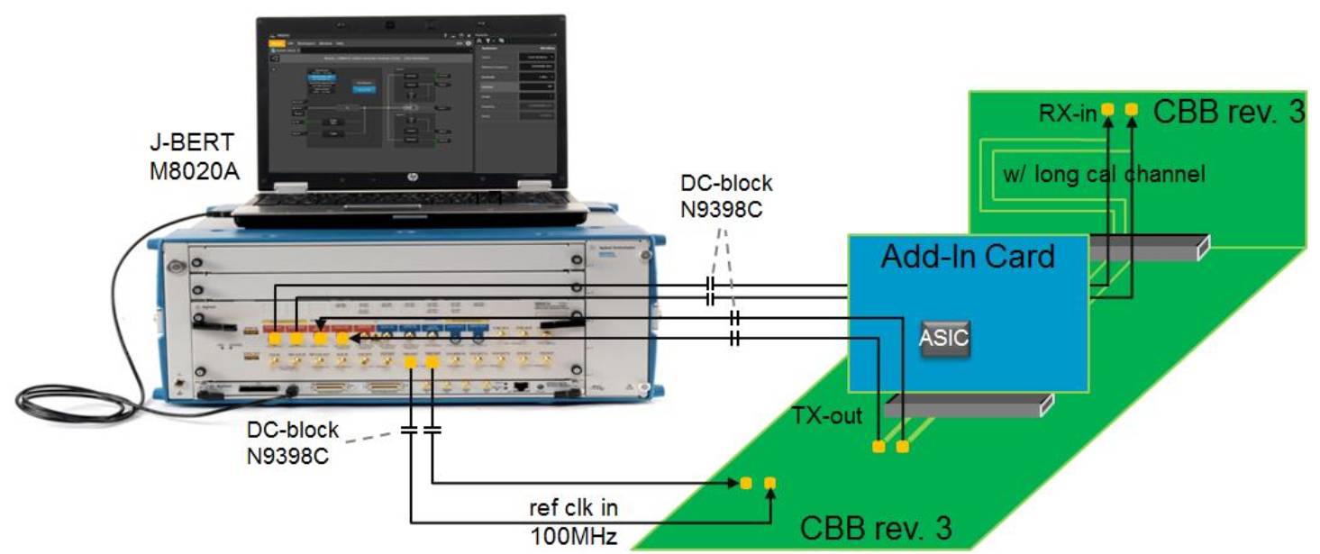 下图简化的Tx测试可以强制DUT发送指定的测试码型,也可以利用M8020A误码仪作为BIST信号发生器,训练DUT进入环回并发射指定测试码型,完成自动化的测试。