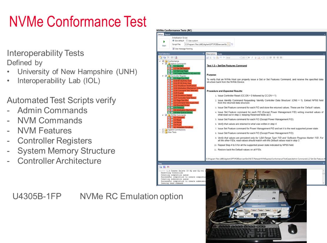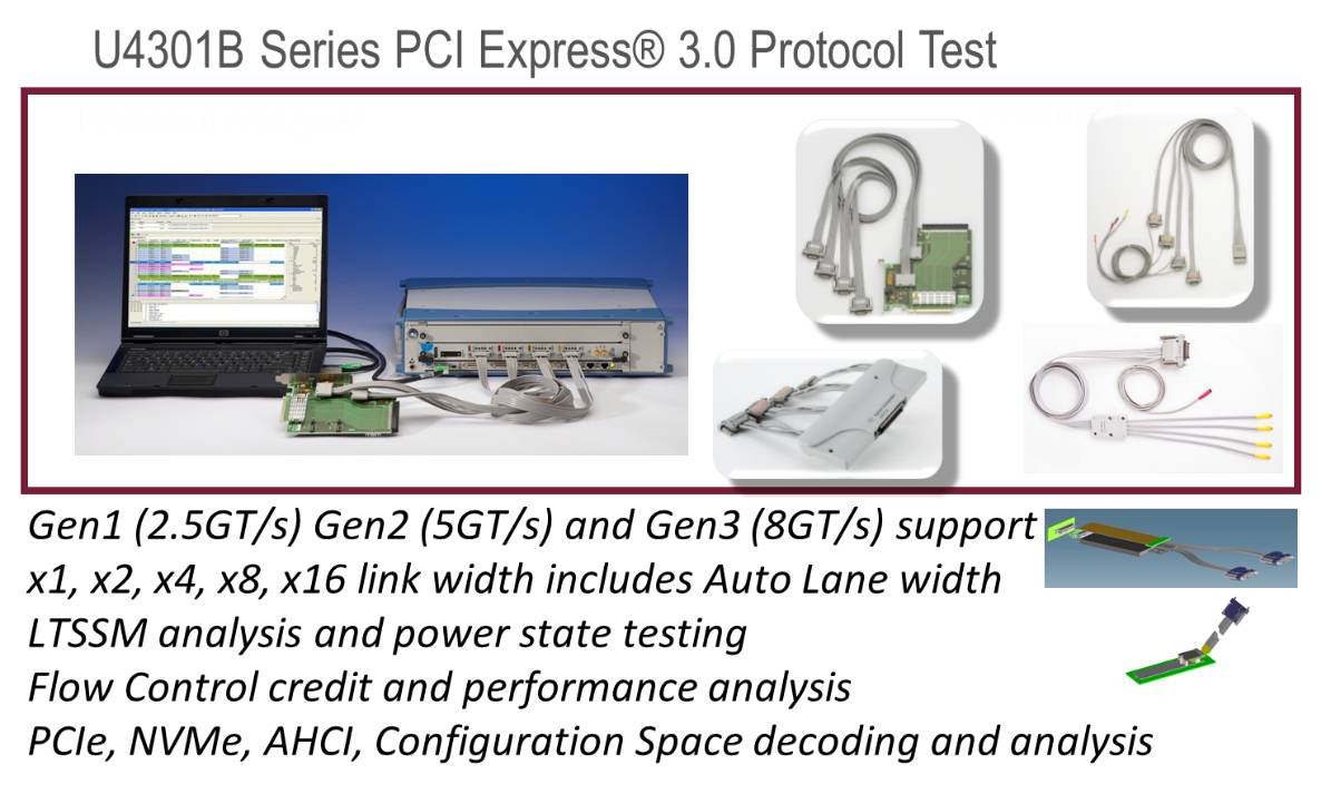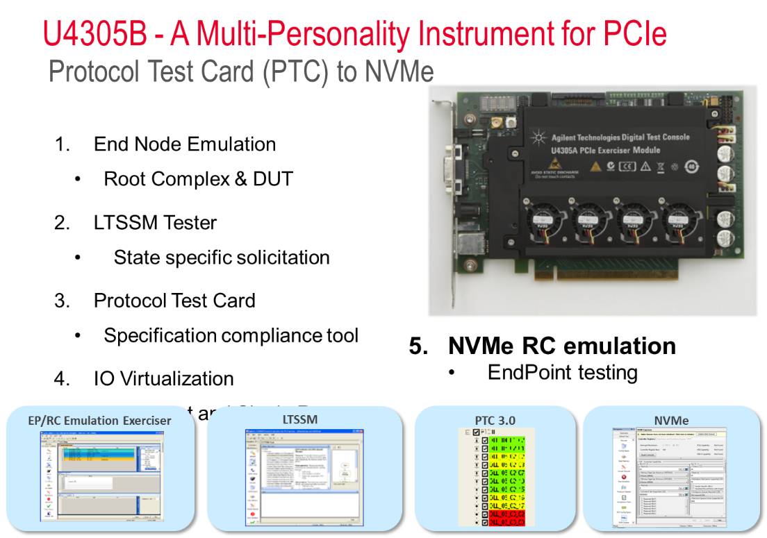 另外,是德科技的U4305B PCIe训练器可以模拟PCIe3.0的主设备或从设备,训练对端被测件,可以进行LTSSM测试,完成PCIe3.0官方的协议一致性测试。另外,针对NVMe,U4305B可以模拟NVMe主设备,产生NVMe会话,发送NVMe命令,与被测件通信,完成NVMe的一致性测试。是德科技也提供PCIe备板设备N5316A,将U4305B和被测件NVMeSSD插卡都插在备板上实现相关的测试。