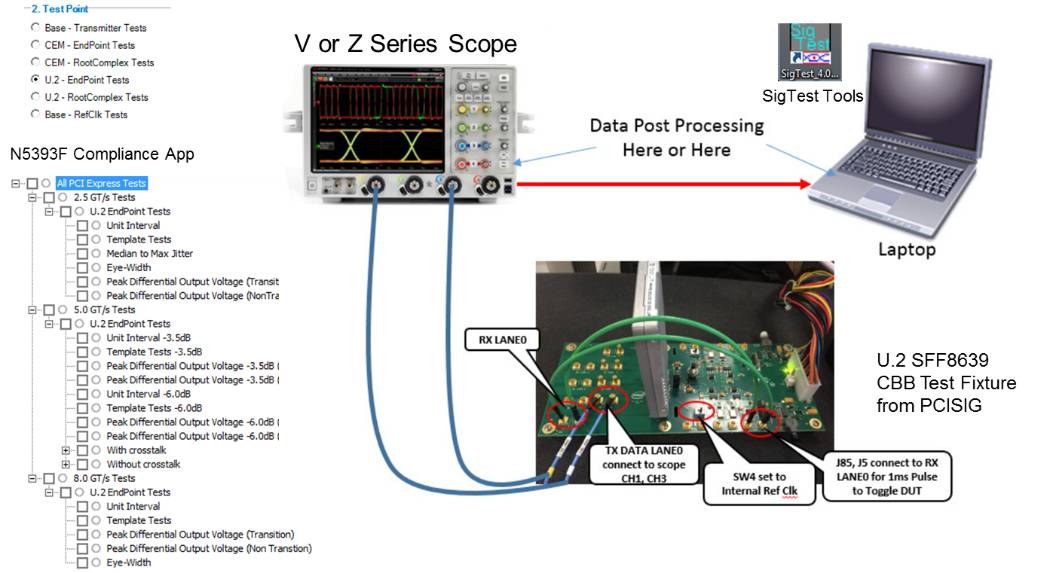 对于U.2(SFF-8639)接口,PCISIG发布了一致性测试夹具,下图展示了U.2接口的NVMe SSD卡的发射机测试连接实物图。可以使用SigTest进行参数测量,也可以使用Z或V系列示波器内部的PCIe一致性测试软件N5393F,支持U.2 End Point测试模式,实现U.2参数的自动化一致性测试。