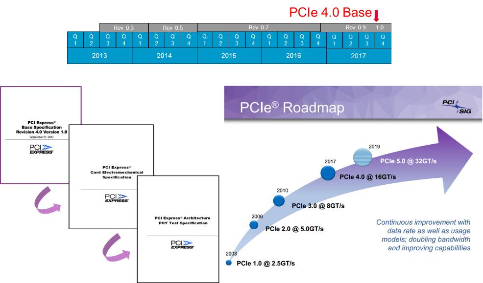首先我们先来了解PCIe总线的情况。2017年10月,PCISIG正式发布了PCIe4.0基础规范1.0版本,这是PCIe规范发展的一个重要里程碑,另外PCIe协会预计会在2019年正式发布PCIe5.0规范。PCIe4.0的传输速度比3.0加倍,达到16GT/s,相信在未来陆续会有支持4.0的CPU、外设产品陆续发布。当然对于NVMe协议来说,短期来说主流还是基于PCIe3.0,未来也有可能有支持4.0的产品。