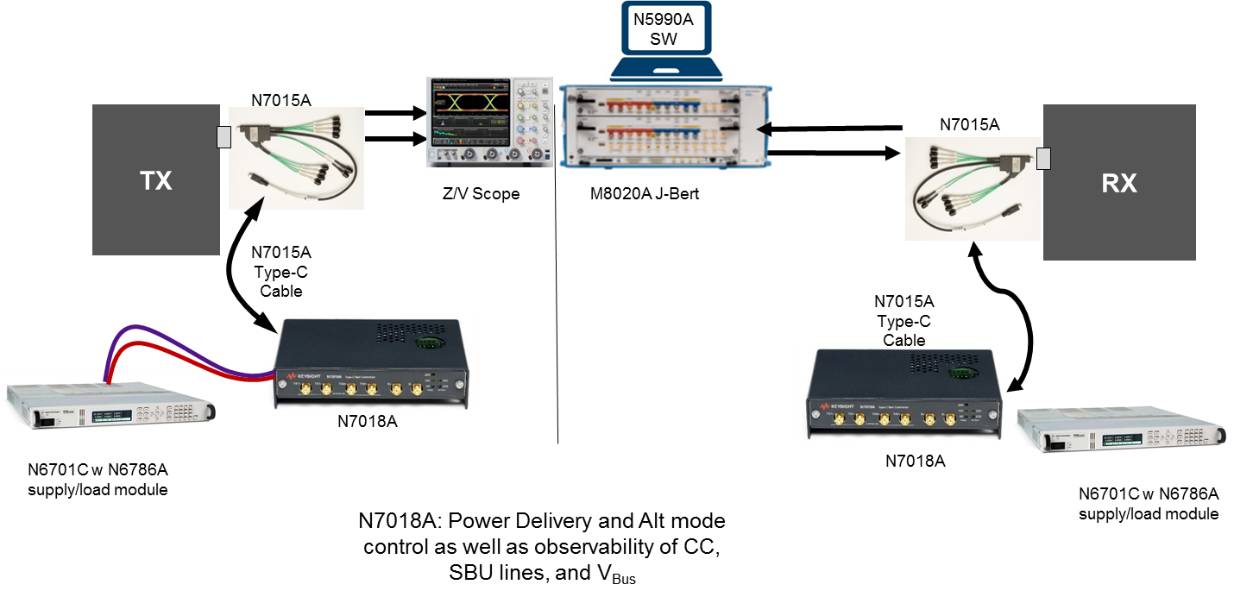 这里展示了越来越普及的Type C接口方式,USB3.1Tx/Rx测试方案,其中N7015A是Type C接口测试夹具,N7018A夹具支持PD和AltMode,并且支持USB3.1 SCD和LBPM的LFPS信号的生成和握手,完成Tx的参数测试。对于Rx测试,M8020A内置ISI功能,可以模拟USB协会规范定义的传输参考通道的插损模型,实现精简连接环境下的Rx接收容忍度测量,并且M8020A也支持CTS中要求的LFPSRx容忍度测量。