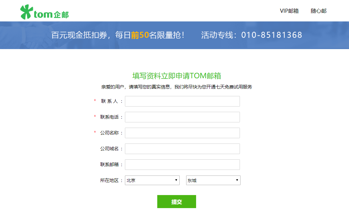(1)打开TOM企业邮箱官网,点击立即试用