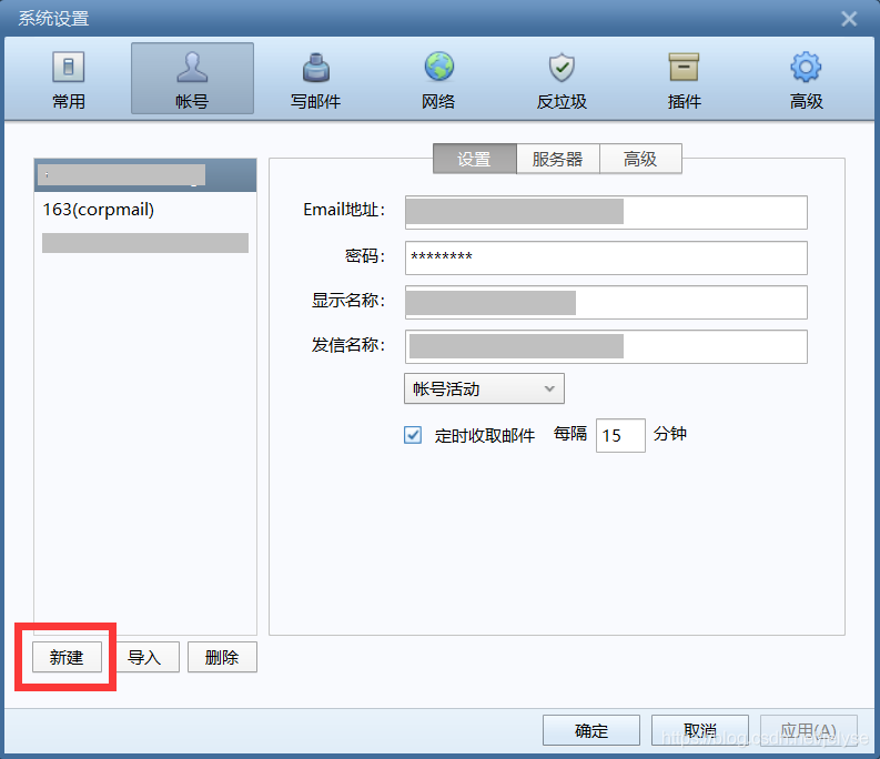 第二步:在新打开的账号设置页面,点击“新建”,在新建账号页面,输入完整的邮箱账号和密码,点击“手动设置”