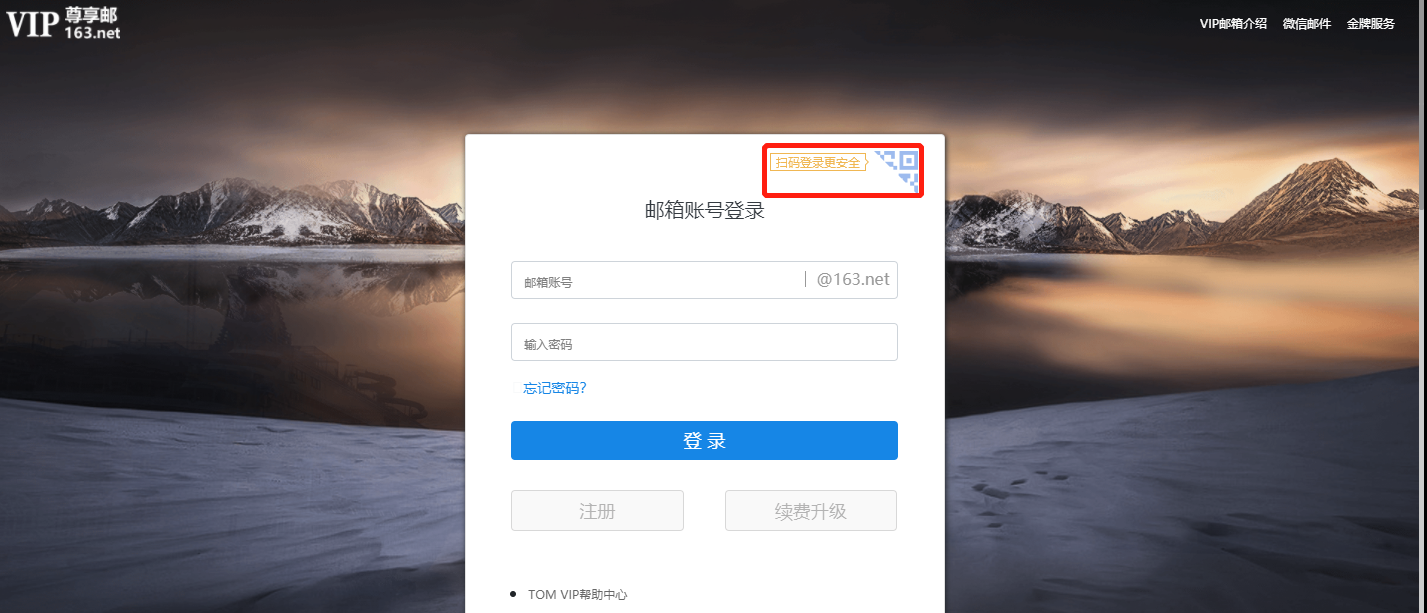 同上,前往163.net/vip.tom.com邮箱官网,如图,可通过右上角的提示,进行扫码安全登录,无需用户名密码。或通过账号密码进行登录。
