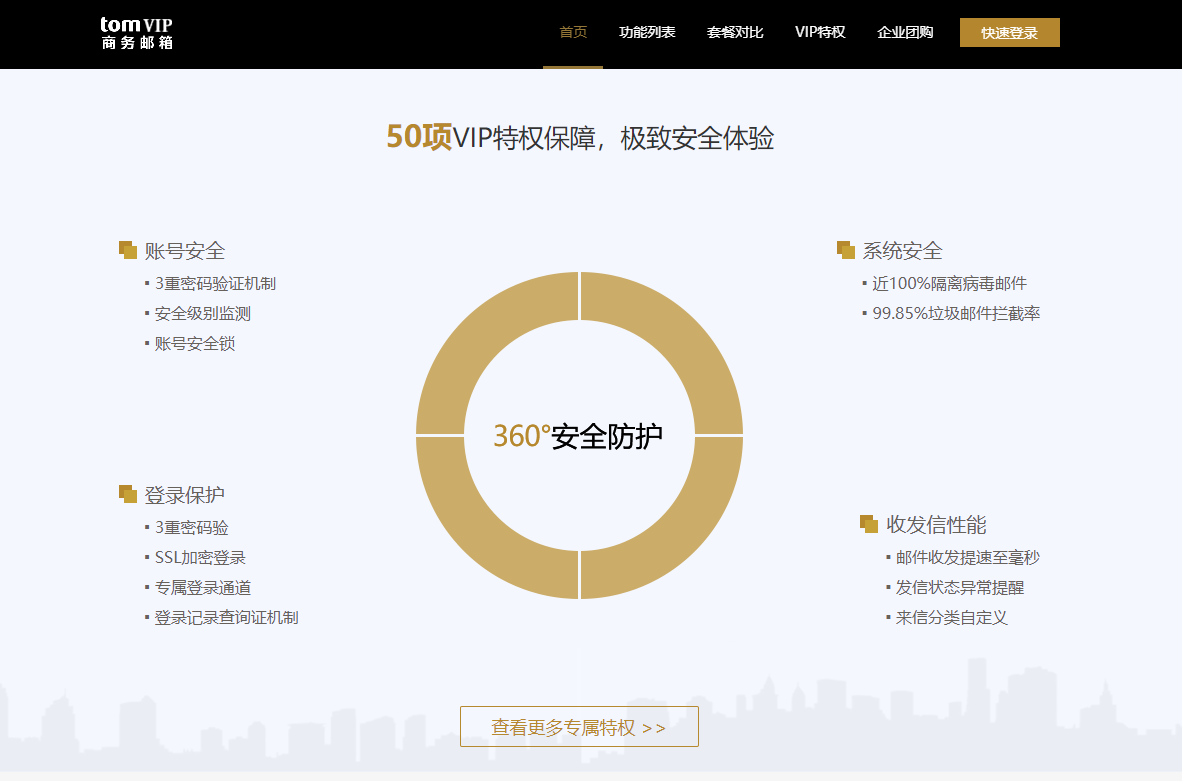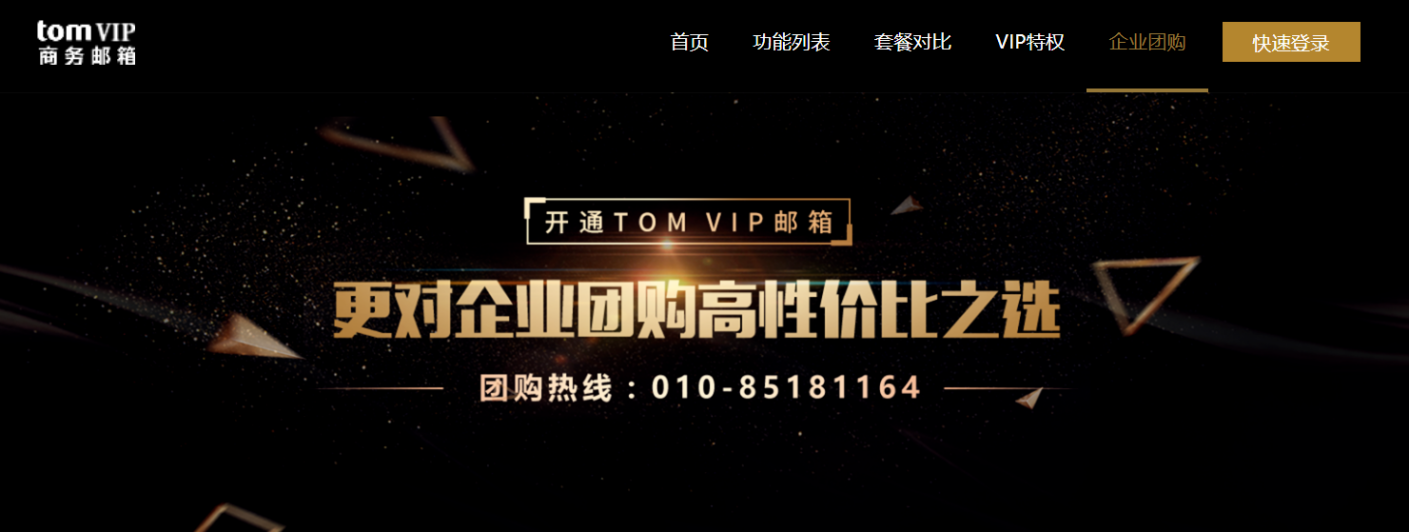 VIP个人商务邮箱,是针对商务个人及中小型企业所使用,通常商务人士对于邮箱的要求较高,倾向选择VIP邮箱。TOM邮箱业内具备企业级的个人邮箱产品,在商务圈被广泛的使用。