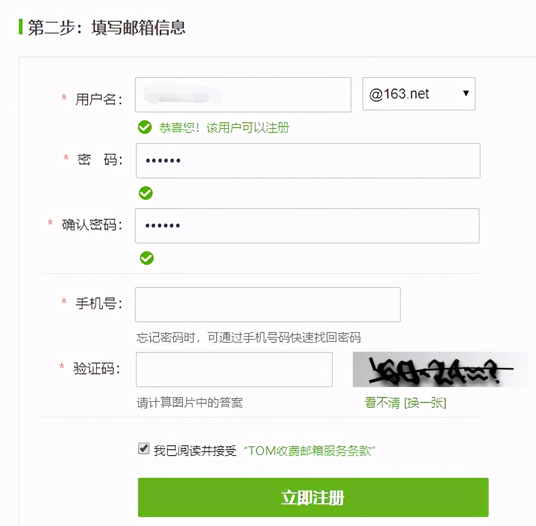 【3】填写邮箱用户名、密码、手机号、验证码信息
