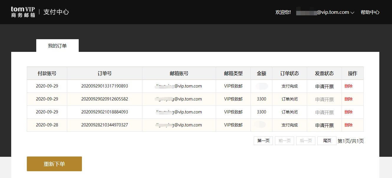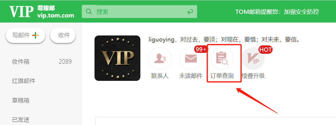 我tom的163VIP邮箱已经用了很多年了,最近是刚升级到无限容量的,因为用的久,现在容量不限制,就不需要删除邮件了。查询付费情况时,有订单记录可以查询的就像在淘宝、京东下单购物一样,具体查询的流程如下: