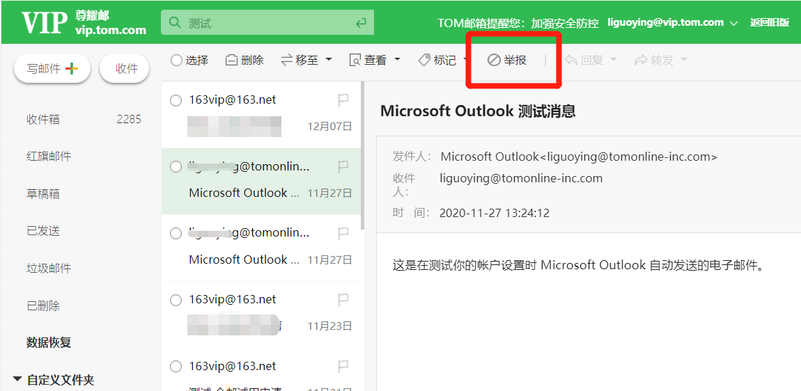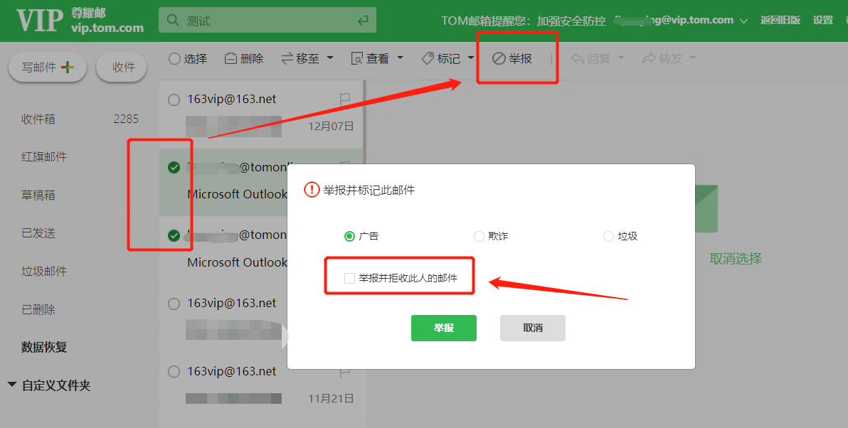 第一步:登录您的VIP邮箱,打开收件箱,勾选您要举报的垃圾邮件,点击【举报】,支持多封邮件一起举报