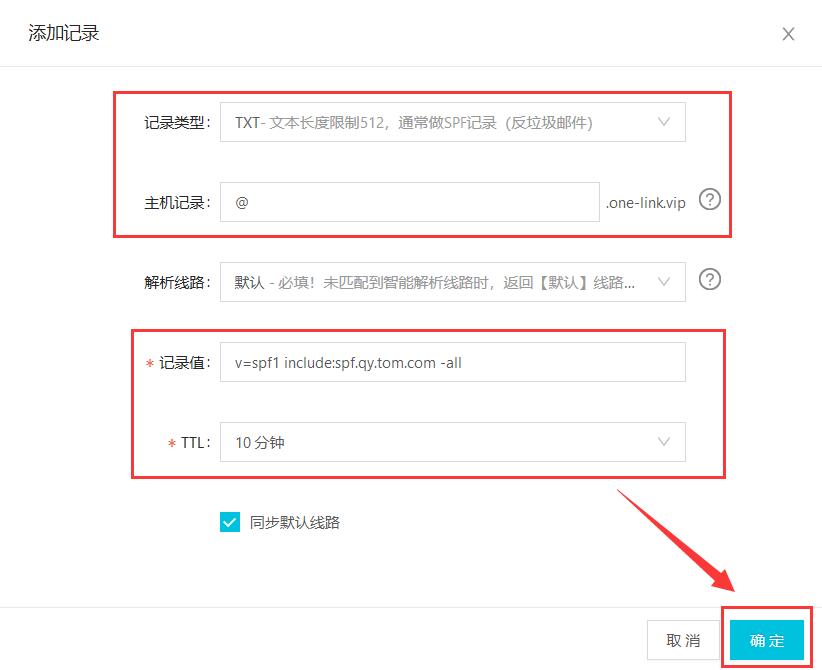 在打开的域名页面点击【添加记录】,按下图指示填写MX记录,点击【确定】,继续点击添加记录,按下图指示填写TXT记录,点击【确定】。添加好域名解析,要全球生效需要时间,一般是10分钟到48小时不等,解析生效后邮箱才能正常收发邮件。