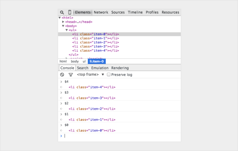 如果你以 “item-4”, “item-3”, “item-2”, “item-1”, “item-0” 的顺序标记下面的这些元素,你可以像下图所示那样在 console 中访问这些 DOM 节点