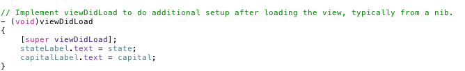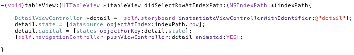 16. Then go back to the ViewController.m file and edit the didSelectRowAtIndexPathMethod so it matches the following. This is just passing data from one view to the other.