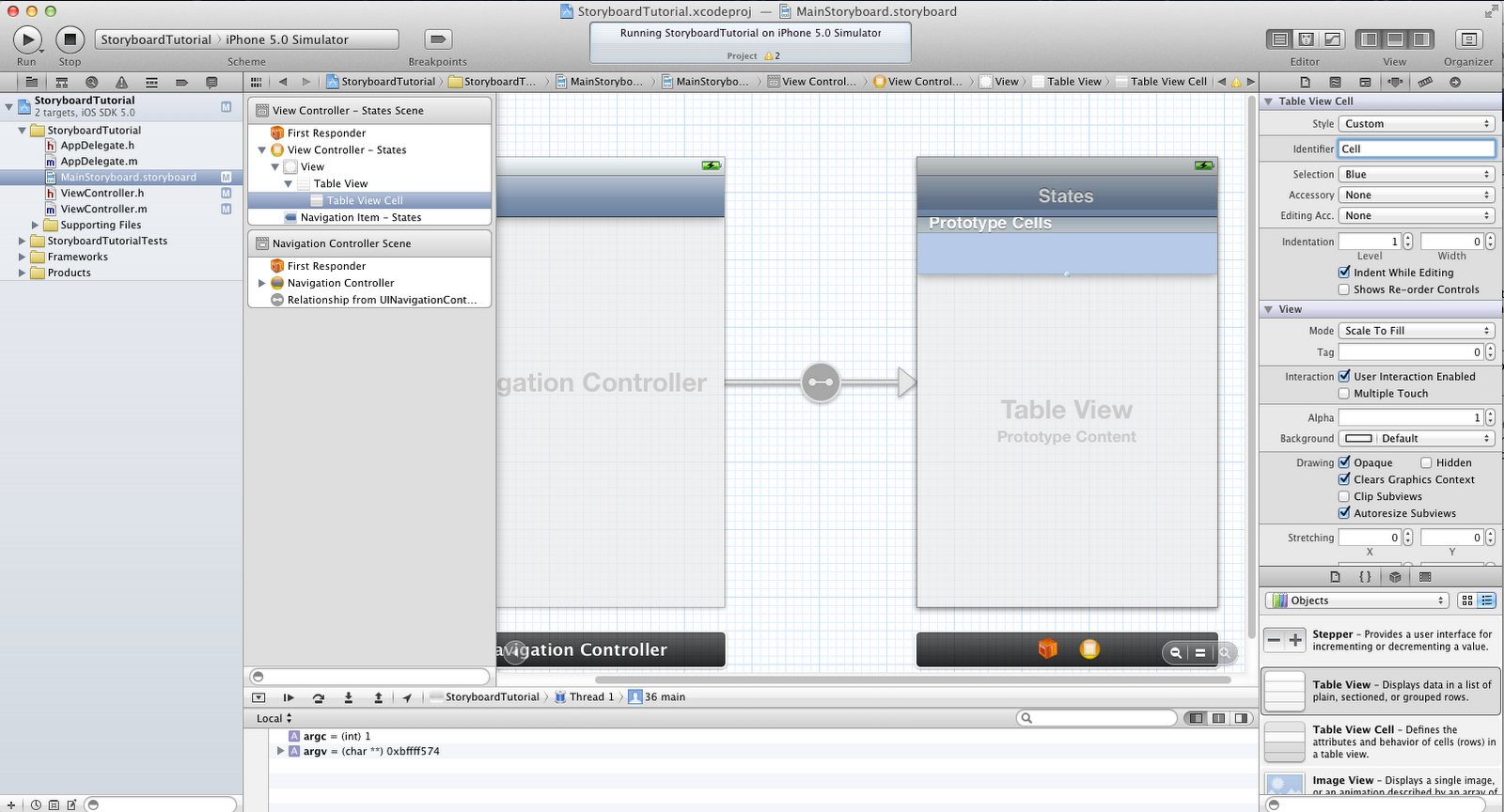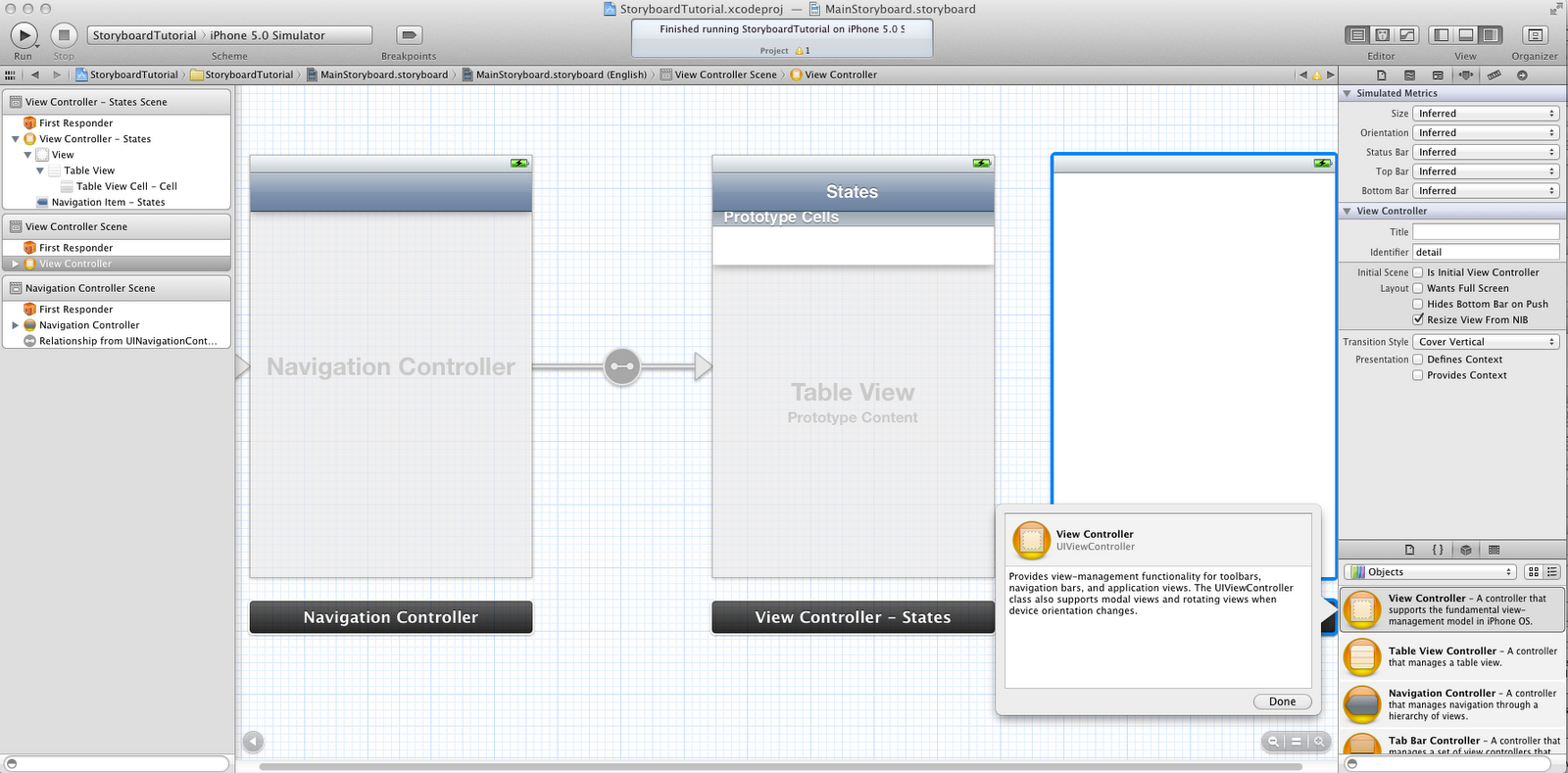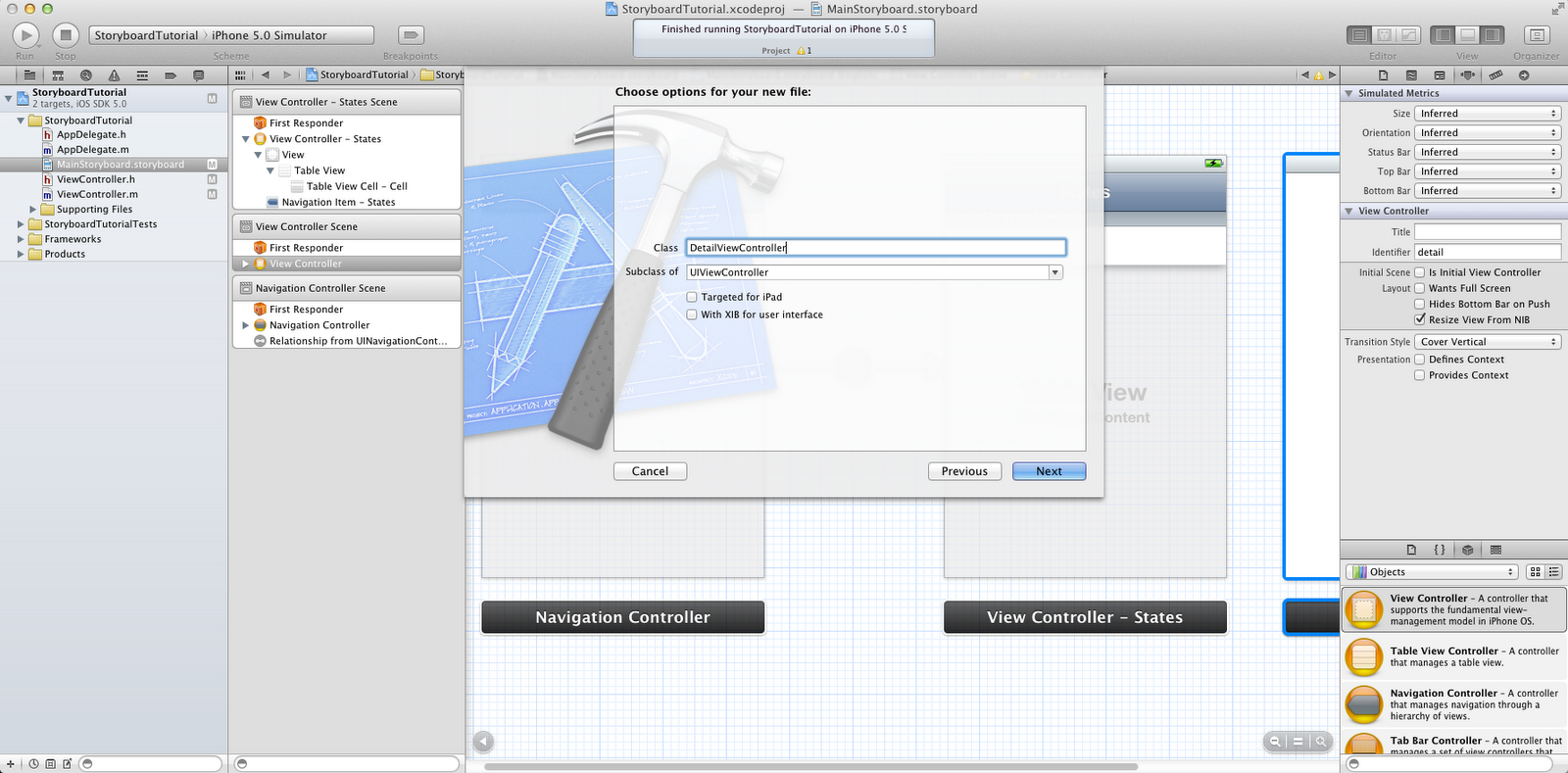 Note: What's new in iOS 5 is the storyboard and transitioning from one view to the other. Instead of having lots of Xib files, you replace them with views all placed into one storyboard file. This makes life much easier for the developer. So seen below is how you create a view controller object in storyboard.