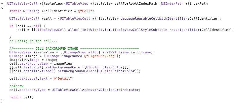 12. Now if you can add a background image to the tableview cell by editing the cellForRowAtIndexPath method. Here I have a 320x65 pixel image called "LightGrey.png" which I'll include in the project at the end of the tutorial. Adding a background image really adds vibrance to your tableview.