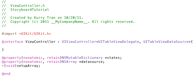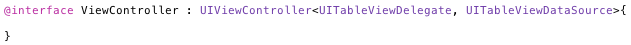 4. Go into the ViewController.h file and add <uitableviewdelegate, uitableviewdatasource="">after it says UIViewController. This tells the compiler that your class will conform to the UITableViewDelegate/UITableViewDataSource protocols. A protocol is just a formal way of saying that you will implement all methods that are required so you have a functioning tableview.