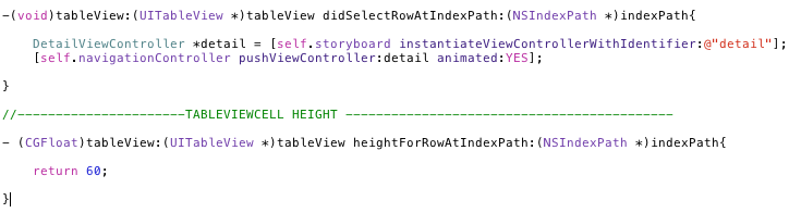 11. Now go back to the ViewController.h file and then add "#import DetailViewController.h" at the top of your file. Then edit the two methods like below.