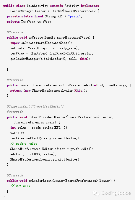 package com.vogella.android.loader.preferences; import android.annotation.SuppressLint; import android.app.Activity; import android.app.LoaderManager; import android.content.Loader; import android.content.SharedPreferences; import android.os.Bundle; import android.widget.TextView; public class MainActivity extends Activity implements LoaderManager.LoaderCallbacks<SharedPreferences> { private static final String KEY = "prefs"; private TextView textView; @Override public void onCreate(Bundle savedInstanceState) { super.onCreate(savedInstanceState); setContentView(R.layout.activity_main); textView = (TextView) findViewById(R.id.prefs); getLoaderManager().initLoader(0, null, this); } @Override public Loader<SharedPreferences> onCreateLoader(int id, Bundle args) { return (new SharedPreferencesLoader(this)); } @SuppressLint("CommitPrefEdits") @Override public void onLoadFinished(Loader<SharedPreferences> loader, SharedPreferences prefs) { int value = prefs.getInt(KEY, 0); value += 1; textView.setText(String.valueOf(value)); // update value SharedPreferences.Editor editor = prefs.edit(); editor.putInt(KEY, value); SharedPreferencesLoader.persist(editor); } @Override public void onLoaderReset(Loader<SharedPreferences> loader) { // NOT used } }