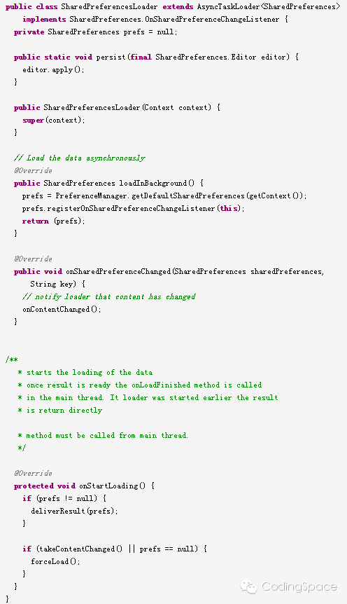 package com.vogella.android.loader.preferences; import android.content.AsyncTaskLoader; import android.content.Context; import android.content.SharedPreferences; import android.preference.PreferenceManager; public class SharedPreferencesLoader extends AsyncTaskLoader<SharedPreferences> implements SharedPreferences.OnSharedPreferenceChangeListener { private SharedPreferences prefs = null; public static void persist(final SharedPreferences.Editor editor) { editor.apply(); } public SharedPreferencesLoader(Context context) { super(context); } // Load the data asynchronously @Override public SharedPreferences loadInBackground() { prefs = PreferenceManager.getDefaultSharedPreferences(getContext()); prefs.registerOnSharedPreferenceChangeListener(this); return (prefs); } @Override public void onSharedPreferenceChanged(SharedPreferences sharedPreferences, String key) { // notify loader that content has changed onContentChanged(); } /** * starts the loading of the data * once result is ready the onLoadFinished method is called * in the main thread. It loader was started earlier the result * is return directly * method must be called from main thread. */ @Override protected void onStartLoading() { if (prefs != null) { deliverResult(prefs); } if (takeContentChanged() || prefs == null) { forceLoad(); } } }