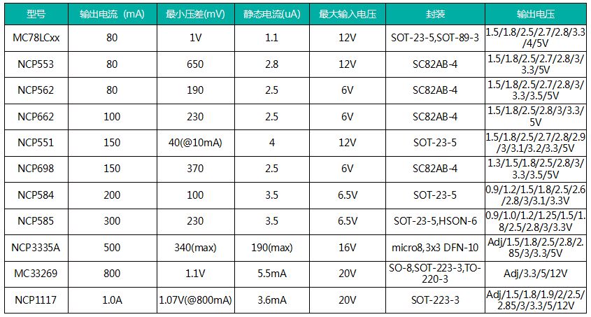 给大家推荐一款安森美制造的极低静态电流的LDO – NCP551,其参数如表3所示,它具有输入电压范围0-20V,输出电流最大能到150mA等性能,是低功耗产品电源芯片的不错选择。为了给工程师更多的选择,如表4所示,表格中是安森美公司制造的低静态电流LDO芯片选型表。