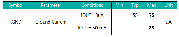 通过查阅LDO手册和反复测试验证,发现超出的电流值就是LDO电源芯片自身的损耗值,如表1所示,工程师所用的LDO电源芯片手册中对“Ground Pin Current--对地电流”参数描述是这样的,没有负载电流的情况下,LDO自身损耗最大就能达到75uA,如果负载电流达到500mA情况下,LDO自身损耗典型值是85uA,由此可见读卡模块电路的最大功耗源头就是LDO,解决方法寻找一个封装兼容,管脚兼容并且静态电流小的LDO型号。