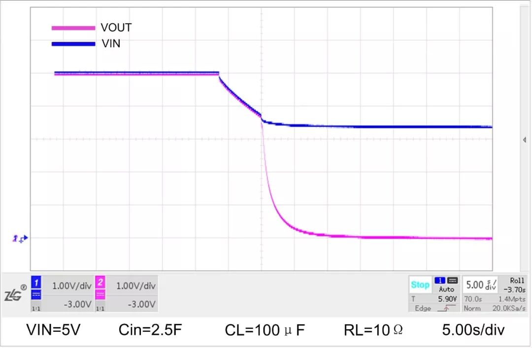 当VIN=5V,Cin=2.5F(超级电容),CL=100μF,RL=10Ω时的上电曲线和掉电曲线如图5图6输入端2.5F超级电容及负载10Ω下电曲线所示。