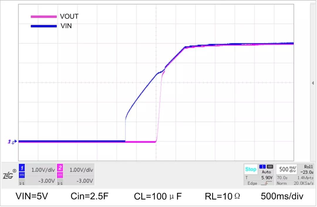 由上面两图可以清楚的看出因为有超级电容的存在,VIN的上电曲线(蓝色曲线)爬升缓慢,而经过模块之后(Vout红色曲线)显著缩短了上电时间,使后级电路能在短时间内达到一种确定的状态。