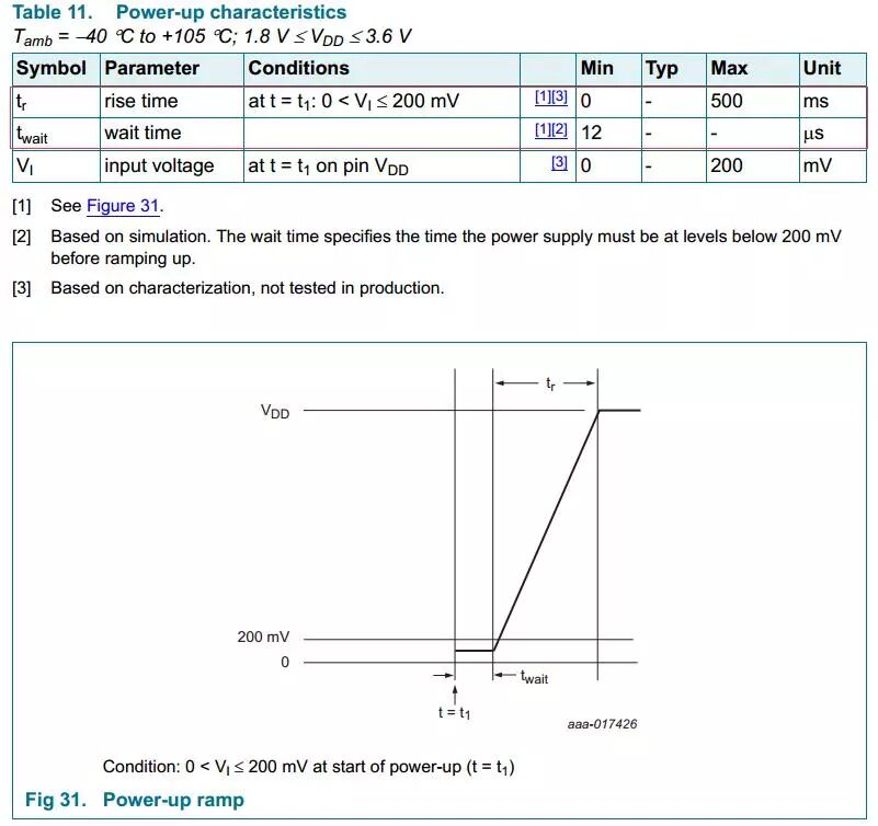 其实上面提到的上电图中,还有一个至关重要的参数,那就是图中的twait。我们可以从图中看到twait的最小数值为12μs。这个参数的含义就是说,在上电之前,芯片的输入电源需保持在200mV以下至少12μs的时间。