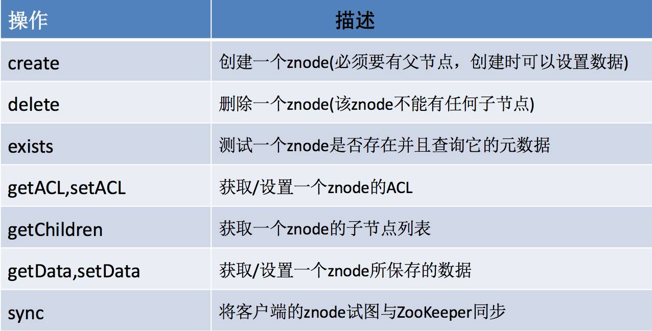 操作:create delete setData getData exists(znode是否存在并且查询他的data) getACL setACL