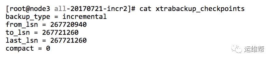 在完整备份和增量备份文件中都有一个文件 xtrabackup_checkpoints 会记录备份完成时检查点的LSN。在进行新的增量备份时,XtraBackup 会比较表空间中每页的 LSN 是否大于上次备份完成的 LSN,如果是,则备份该页,并记录当前检查点的 LSN。