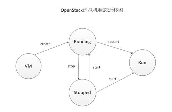 基于模型的人工智能测试,首先就是要把各种OpenStack操作定义成模型。这里我们拿虚拟机的各种操作举例。通常,虚拟机具有多种状态,如运行、暂停、重启、迁移、快照等等,此时,我们可以在状态和状态之间定义一些标准的操作。当把这些状态和操作画出来后,我们就可以得到虚拟机的状态迁移图(或者说是虚拟机场景)。如下图所示。