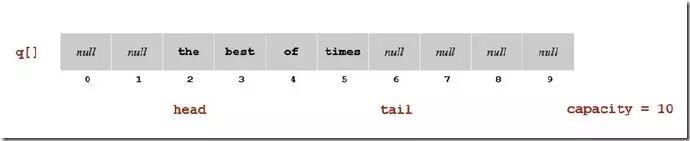 同样地,现在再来看如何使用数组来实现Queue,首先我们使用数组来保存数据,并定义变量head和tail来记录Queue的首尾元素。
