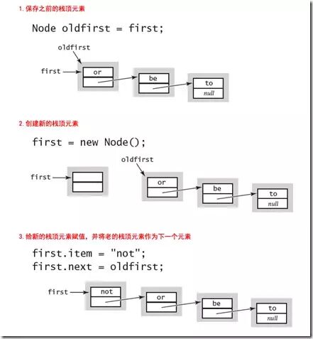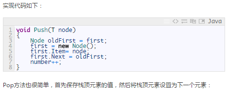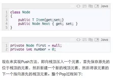 Stack<T>() 创建一个空的栈 void Push(T s) 往栈中添加一个新的元素 T Pop() 移除并返回最近添加的元素 boolean IsEmpty() 栈是否为空 int Size() 栈中元素的个数 要实现这些功能,我们有两中方法,数组和链表,先看链表实现: