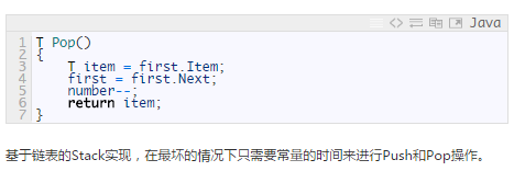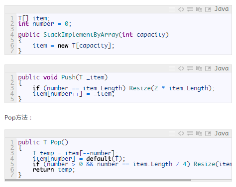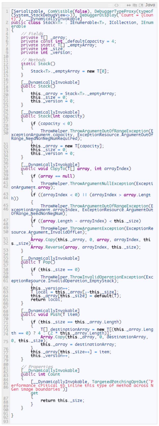 可以看到.NET中的Stack的实现和我们之前写的差不多,也是使用数组来实现的。.NET中Stack的初始容量为4,在Push方法中,可以看到当元素个数达到数组长度时,扩充2倍容量,然后将原数组拷贝到新的数组中。Pop方法和我们之前实现的基本上相同,下面是具体代码,只截取了部分: