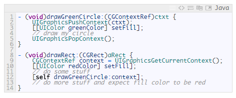 可以看到,在drawGreenCircle方法中,在设置填充颜色之前,我们Push保存了绘图上下文的信息,然后在设置当前操作的一些环境变量,绘制图形,绘制完成之后,我们Pop出之前保存的绘图上下文信息,从而不影响后面的绘图。