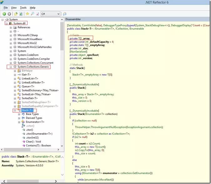 在.NET中有Stack和Queue泛型类,使用Reflector工具可以查看其具体实现。先看Stack的实现,下面是截取的部分代码,仅列出了Push,Pop方法,其他的方法希望大家自己使用Reflector查看: