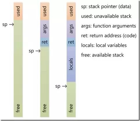 当发起函数调用的时候,CPU使用特殊的指令将当前的指令指针(instruction pointer),如当前执行的代码的地址压入到堆上。然后CPU通过设置指令指针到函数调用的地址来跳转到被调用的函数去执行。当函数返回值时,旧的指令指针从堆中Pop出来,然后从该指令地址之后继续执行。