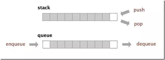 概念很简单,栈 (Stack)是一种后进先出(last in first off,LIFO)的数据结构,而队列(Queue)则是一种先进先出 (fisrt in first out,FIFO)的结构,如下图: