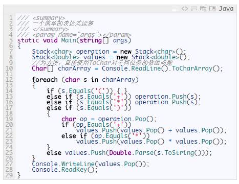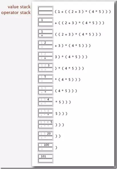 Stack使用的一个最经典的例子就是算术表达式的求值了,这其中还包括前缀表达式和后缀表达式的求值。E. W. Dijkstra发明了使用两个Stack,一个保存操作值,一个保存操作符的方法来实现表达式的求值,具体步骤如下: