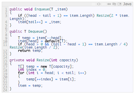 和Stack的实现方式不同,在Queue中,我们定义了head和tail来记录头元素和尾元素。当enqueue的时候,tial加1,将元素放在尾部,当dequeue的时候,head减1,并返回。