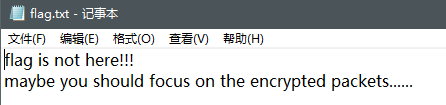 解密后从压缩包中提取到了一个flag.txt,打开发现是假的flag,并提示“maybe you should focus on the encrypted packets......”,意思是“也许你应该关注加密的数据包...”
