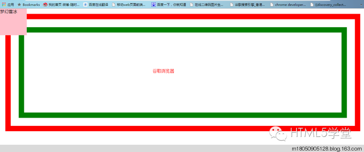 1 <!doctype html> 2 <html> 3 <head> 4 <meta charset="UTF-8"> 5 <title>HTML5Course - 梦幻雪冰</title> 6 <link rel="stylesheet" href="reset.css"> 7 <style> 8 /*正常是不能这么设置的,这边主要是用来测试*/ 9 html { 10 margin: 20px; 11 border: 20px solid red; 12 } 13 /*正常是不能这么设置的,这边主要是用来测试*/ 14 body { 15 height: 400px; 16 margin: 30px; 17 border: 20px solid green; 18 } 19 .wrap { 20 position: absolute; 21 top: 0; 22 left: 0; 23 width: 100px; 24 height: 100px; 25 background-color: pink; 26 } 27 </style> 28 </head> 29 <body> 30 <div class="wrap">梦幻雪冰</div> 31 </body> 32 </html>