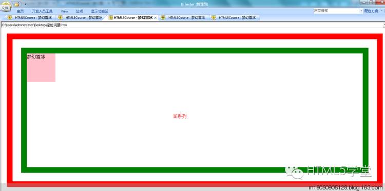 1 <!doctype html> 2 <html> 3 <head> 4 <meta charset="UTF-8"> 5 <title>HTML5Course - 梦幻雪冰</title> 6 <link rel="stylesheet" href="reset.css"> 7 <style> 8 /*正常是不能这么设置的,这边主要是用来测试*/ 9 html { 10 margin: 20px; 11 border: 20px solid red; 12 } 13 /*正常是不能这么设置的,这边主要是用来测试*/ 14 body { 15 position: relative; 16 height: 400px; 17 margin: 30px; 18 border: 20px solid green; 19 } 20 .wrap { 21 position: absolute; 22 top: 0; 23 left: 0; 24 width: 100px; 25 height: 100px; 26 background-color: pink; 27 } 28 </style> 29 </head> 30 <body> 31 <div class="wrap">梦幻雪冰</div> 32 </body> 33 </html>