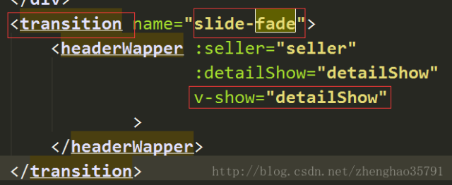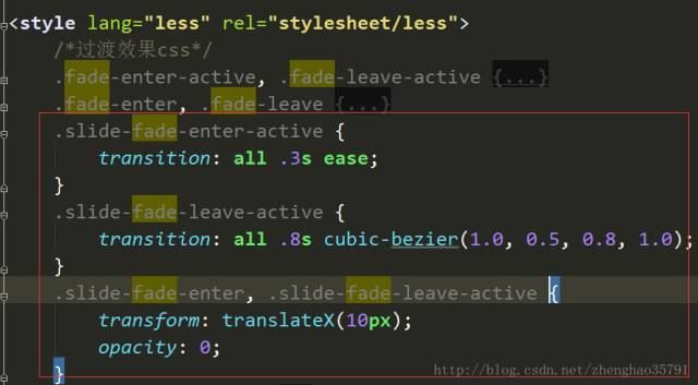 下图所示是一个简单的过渡效果的例子,需要将想实现过渡效果的元素放在transition标签中包裹,通过name=“slide-fade”来声明过渡效果名称,并在对应的vue文件中添加过渡效果 的css样式,这样就可以简单的完成该元素的过渡效果。