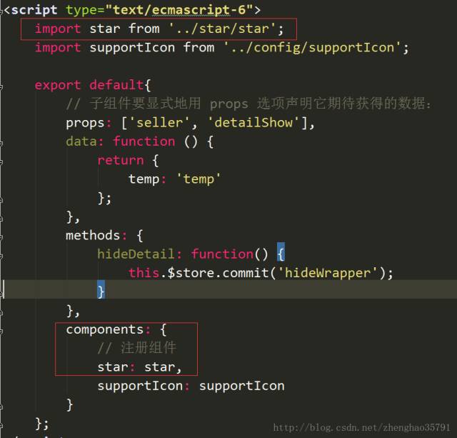 如何在其他的vue文件中使用这个star组件呢?如下图所示,首先通过import引入star组件对象,并在想使用star组件的vue文件中声明注册star组件。现在就可以愉快的通过标签来在该vue文件中任意地方使用star组件了。在你想展示一个五角星的地方,使用一个star标签,就可以轻松完成这个功能。