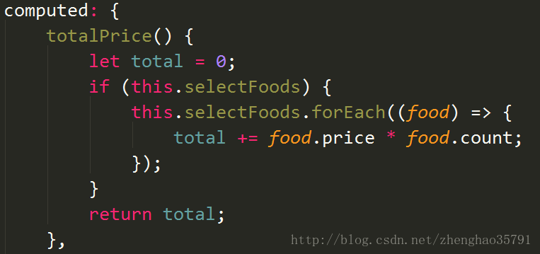 如上图所示,在html中,我们只需要使用{{totalPrice}}这个计算属性就可以来表示最终的商品总额。我们不需要关注这个变量的数值变化,totalPrice这个变量的逻辑写在对应的computed计算属性中。