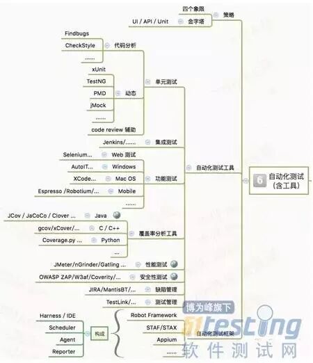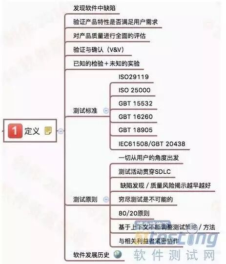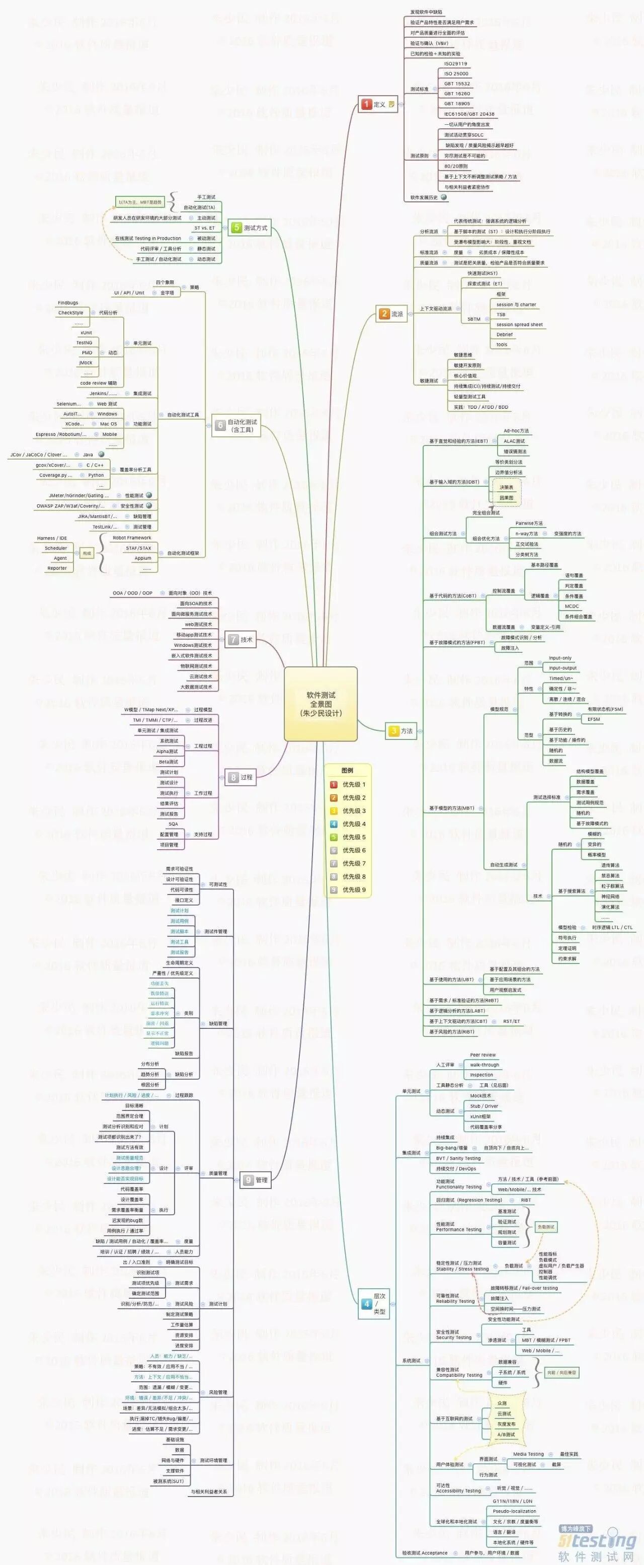 “软件测试全景图”整个思维导图有9个模块,分别是: