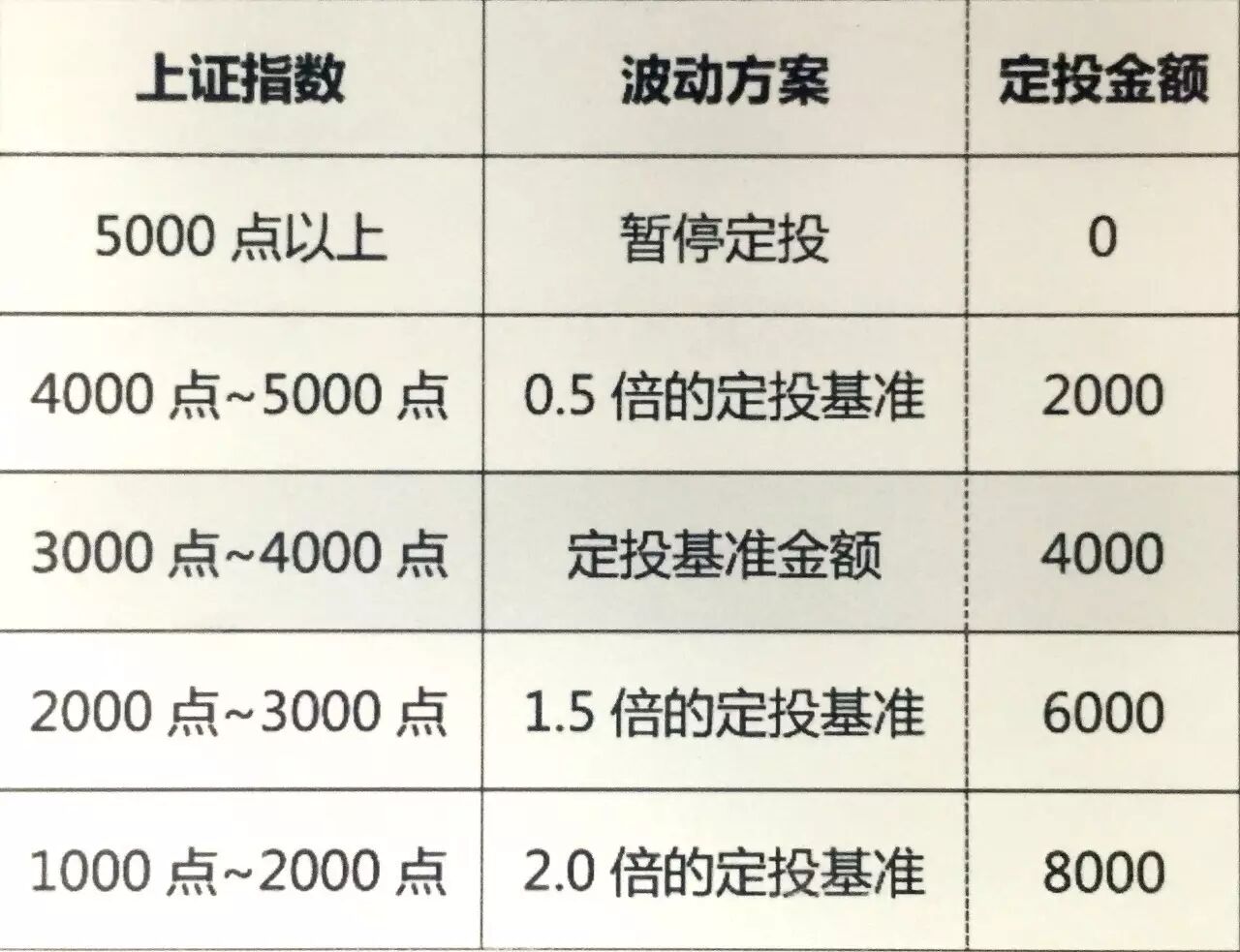 假设每月定投4000元,以行情3000-4000点为基准,如果股指太高,减少一半定投金额,如果股指点位低,适当加大金额。5000点我们不贪婪,1000点我们不恐惧。
