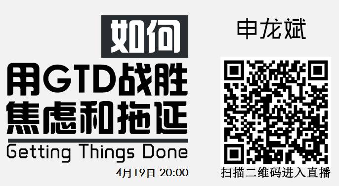 GTD的内容确实挺多的,我尝试着把五年多的GTD实践经验浓缩整理出来,4月19日晚上8点,将在“一块听听”平台上进行一场直播,让你在1小时内领会GTD的核心理念和方法,再通过一段时间的践行,必能减少焦虑和拖延。