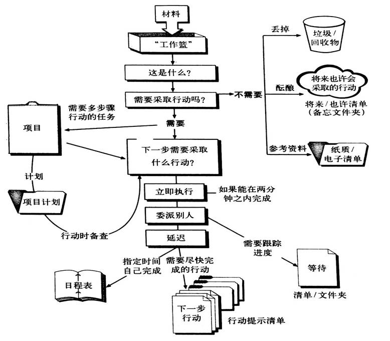 所有事务收集到GTD系统中后,有清晰的处理流程,或丢弃、或归档、或立即执行、或委派他人、或等待、或放在日程表中,最后剩下的都是下一步行动清单,根据不同的情境专注地把事情做完(Getting Things Done)。