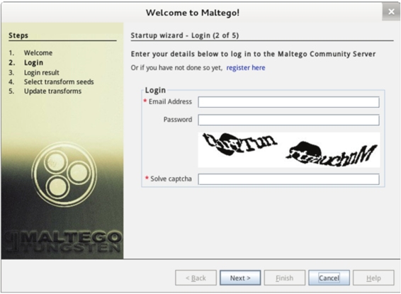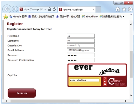 在使用Maltego工具之前,需要到https://www.paterva.com/web6/community/maltego/网站注册一个账号。注册界面如图4.9所示。